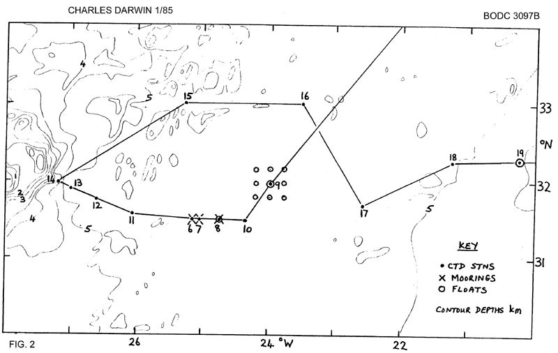 2) Deployment of a near surface current buoy at the same location. 3) Deployment of four SOFAR floats near 41deg 30'N 14deg 30'W. 4) Working a line of CTD stations across the east Azores Fracture Zone. 5) Recovery of three current meter moorings at GME (31deg 30'N 25deg 00'W). 6) Deployment of replacement moorings at GME. 7) Deployment of a deepsea tide gauge in GME area. 8) Working of CTD stations in GME area and around the Madeira abyssal plain. |